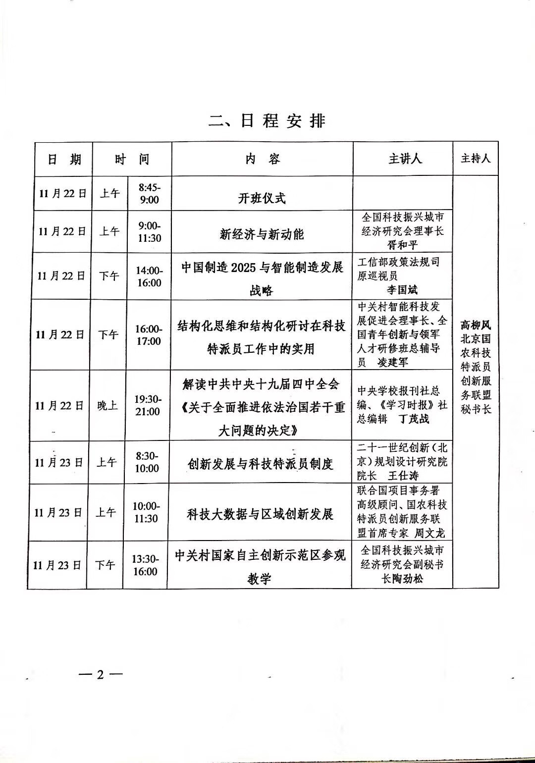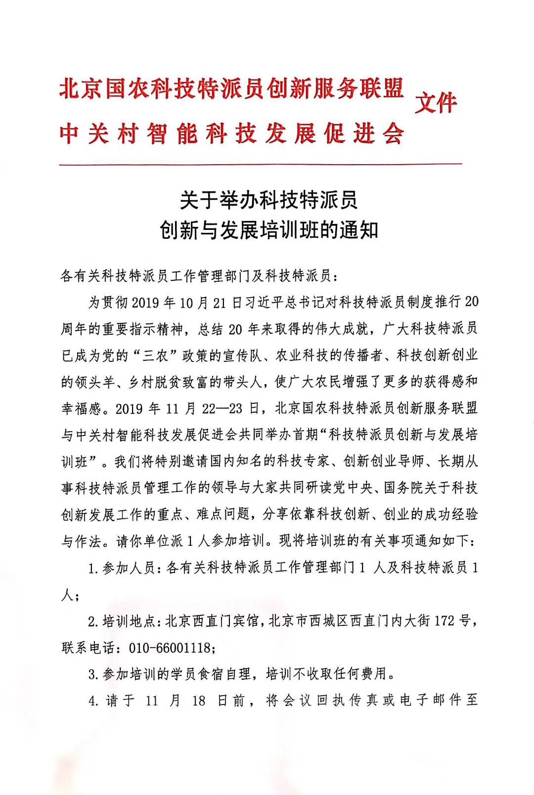 為貫徹2019年10月21日習近平總書記對科技特派員制度推行20周年的重要指示精神,總結(jié)20年來取得的偉大成就,廣大科技特派員已成為黨的“三農(nóng)”政策的宣傳隊、農(nóng)業(yè)科技的傳播者、科技創(chuàng)新創(chuàng)業(yè)的領(lǐng)頭羊、鄉(xiāng)村脫貧致富的帶頭人,使廣大農(nóng)民增強了更多的獲得感和幸福感。2019年11月22—23日,全國科技振興城市經(jīng)濟研究會與北京國農(nóng)科技特派員創(chuàng)新服務(wù)聯(lián)盟共同舉辦首期“科技特派員創(chuàng)新與發(fā)展培訓班”。我們將特別邀請國內(nèi)知名的科技專家、創(chuàng)新創(chuàng)業(yè)導師、長期從事科技特派員管理工作的領(lǐng)導與大家研讀黨中央、國務(wù)院關(guān)于科技創(chuàng)新發(fā)展工作的重點、難點問題,分享依靠科技創(chuàng)新、創(chuàng)業(yè)的成功經(jīng)驗與作法。請你單位派1人參加培訓。現(xiàn)將培訓班的有關(guān)事項通知如下: