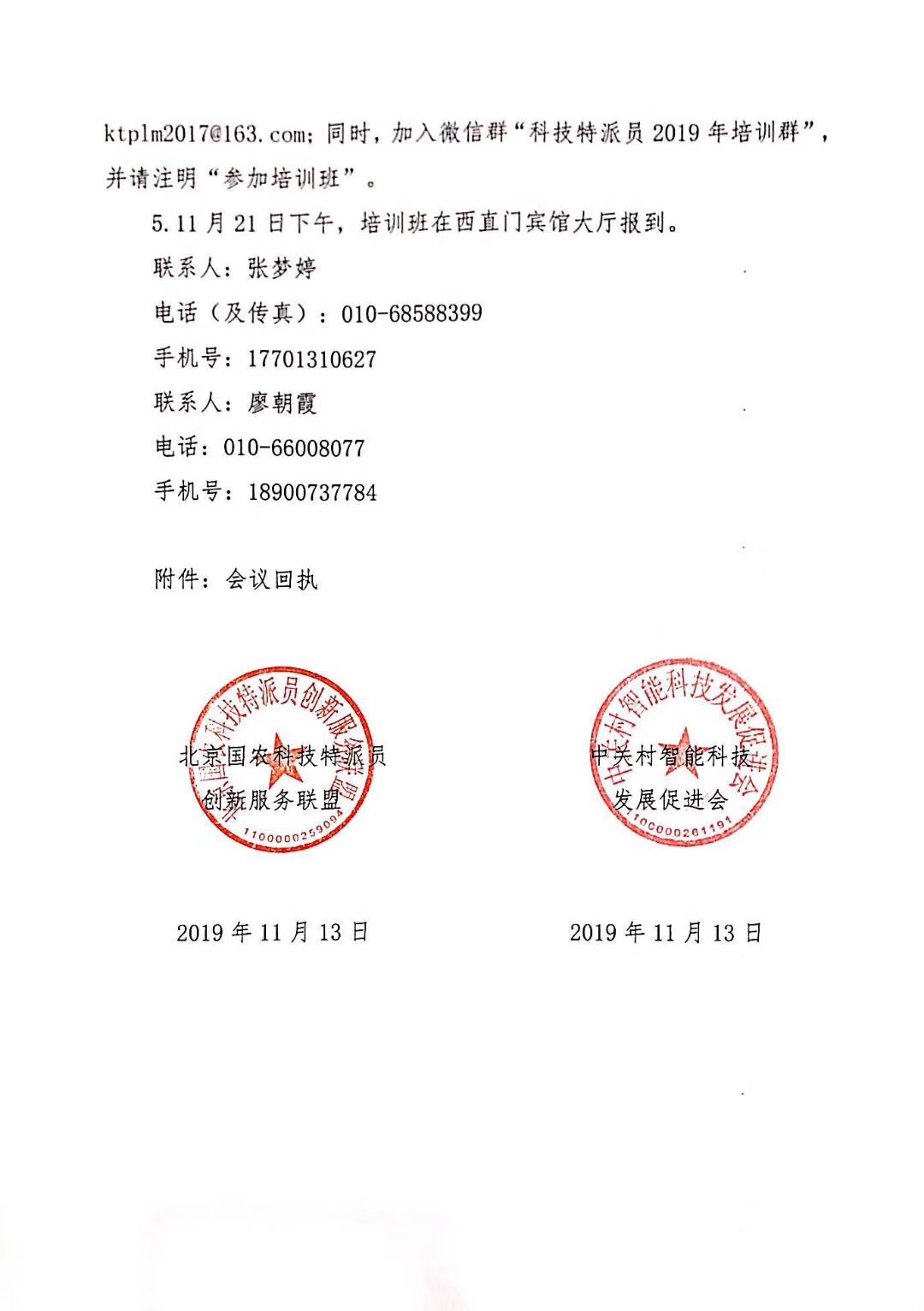 4.請于11月18日前,將會議回執(zhí)傳真或電子郵件至北京國農(nóng)科技特派員創(chuàng)新服務(wù)聯(lián)盟,同時加入微信群“科技特派員2019年培訓群”,加入微信群時請注明“參加培訓班”。