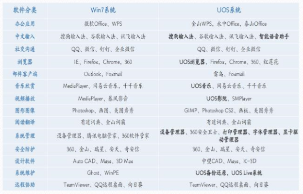 表二:UOS系統(tǒng)與Win7系統(tǒng)功能對比