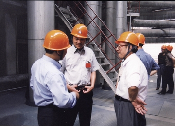 秦裕琨院士(前右一)與焦作電廠總工、西安熱工院院長在焦作電廠爐前