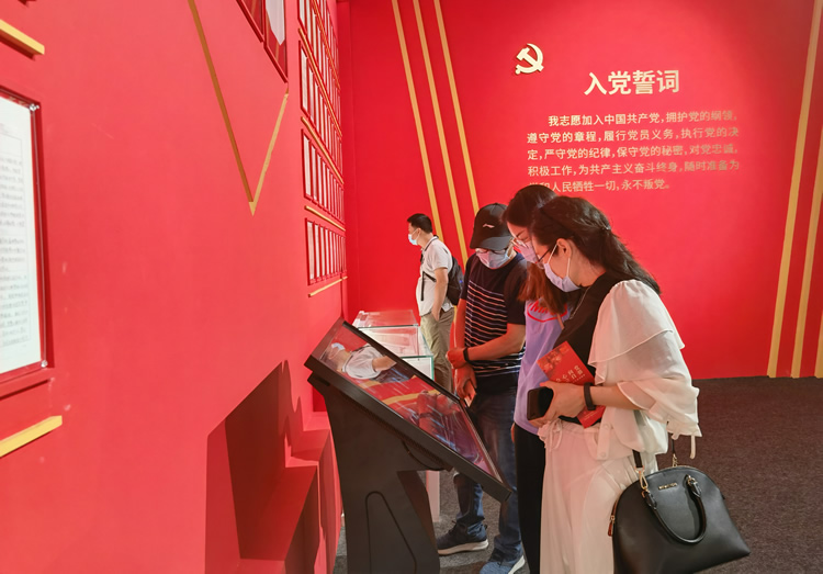 “永遠(yuǎn)跟黨走”一面紅墻最頂部寫著五個(gè)亮眼的大字,紅墻之上陳列滿了百位科學(xué)家的入黨申請(qǐng)書。泛黃的紙張上,科學(xué)家們工整優(yōu)美的字跡,真誠質(zhì)樸的心聲,包含著他們?yōu)辄h為國的一片赤誠。