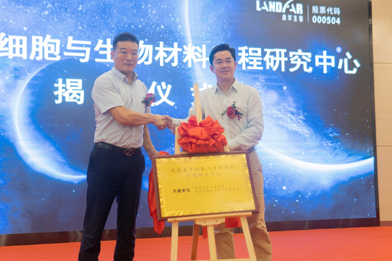 南華生物總經(jīng)理游昌喬(左)與湖南大學(xué)教授、岳麓學(xué)者聶和民(右)共同為湖南大學(xué)與南華生物共建的湖南省干細(xì)胞與生物材料工程研究中心揭牌。