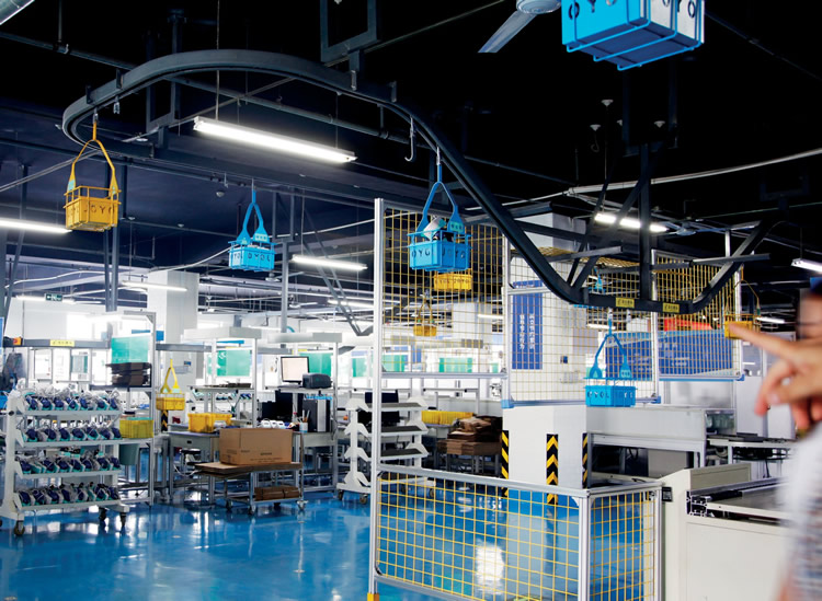 給記者印象很深刻的是,在組裝車間,記者看到類似mini版的“過(guò)山車”,公司技術(shù)總監(jiān)孫發(fā)君介紹說(shuō)那是吊裝流水線,可以將半成品樓上樓下自動(dòng)運(yùn)送,樓上組裝后的產(chǎn)品自動(dòng)運(yùn)送到樓下進(jìn)行系列檢測(cè),然后再運(yùn)送到樓上自動(dòng)打包機(jī)打包碼貨,現(xiàn)在1人可替代原來(lái)4個(gè)人的工作量,不僅提高了空間利用率、崗位配用率,還有效提升了生產(chǎn)效率。