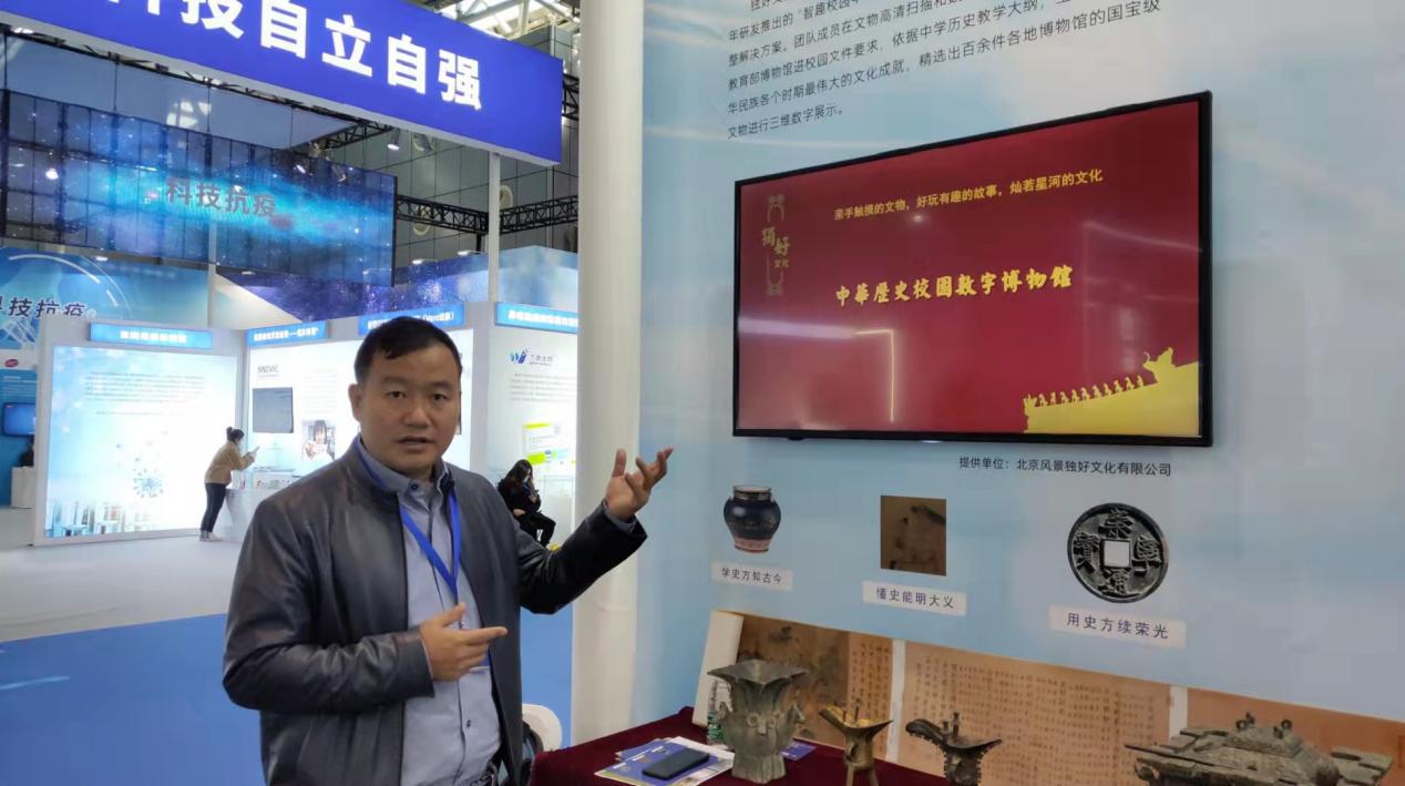 在2021年全國雙創(chuàng)周北京會場的展廳內,由北京風景獨好文化有限公司帶來的“中華歷史數(shù)字博物館”項目,現(xiàn)場演示了以往只能在少數(shù)博物館中展出的珍貴文物的3D影像。