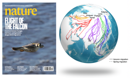 中國科學院動物研究所詹祥江團隊歷時12年,通過整合多年衛(wèi)星追蹤數(shù)據(jù)和種群基因組信息,建立了一套大陸尺度的的北極游隼(Falco peregrinus)遷徙研究系統(tǒng)。研究人員闡明了氣候變化在鳥類遷徙路線形成、維持及未來變化趨勢中的驅(qū)動作用,發(fā)現(xiàn)一個和記憶能力相關的基因ADCY8在遷徙距離更長的游隼種群中受到正選擇,揭示了長時記憶可能是鳥類長距離遷徙的重要基礎。該研究全面結(jié)合遙感衛(wèi)星追蹤、基因組學、神經(jīng)生物學等新型研究手段,展現(xiàn)了學科交叉型的創(chuàng)新性研究在回答重大科學問題中的關鍵作用。