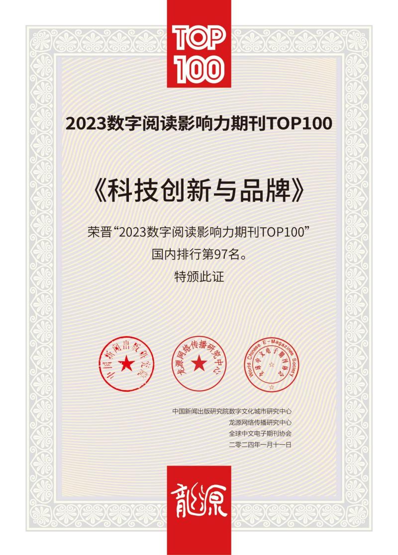 2024年1月11日,2023年數(shù)字閱讀影響力期刊TOP100榜單通過線上元宇宙會議的形式發(fā)布,《科技創(chuàng)新與品牌》連續(xù)第6年進入TOP100榜單,榮登2023數(shù)字影響力期刊TOP100國內(nèi)排行第97名。再次彰顯了本刊作為專注于報道科技人才成就、聚焦科技創(chuàng)新成果、宣傳培育品牌范例的國家級綜合期刊的強大影響力、傳播力以及讀者極高的認可度。